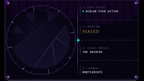 The visual identity is built around arcane signal technology: dark near-black backgrounds, cut-corner octagonal geometry, and a teal/purple/gold color palette rendered in three custom typefaces. Every overlay maintains this language consistently, from a single notification to a full-screen cinematic event.
