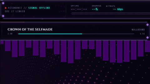A full-width 1920×80 always-on overlay. Displays live signal status, stream vitals, and session metadata. Contains a built-in music player that activates automatically on specific OBS scenes (stream starting, BRB) and deactivates on others. Additional display panels (domain balance, featured viewer) are data-gated and unlock when collective engagement thresholds are reached — they render as sealed/locked until the conditions are met.